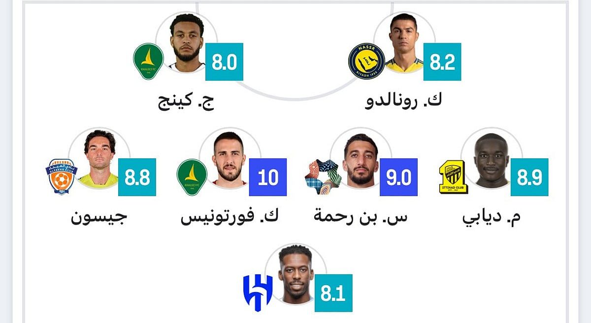 كشفت شبكة "Sofascore" العالمية المتخصصة في الإحصائيات الرياضية، عن التشكيلة المثالية للجولة السابعة من دوري روشن للمحترفين، والتي خلت من أي لاعب من فريق الأهلي.