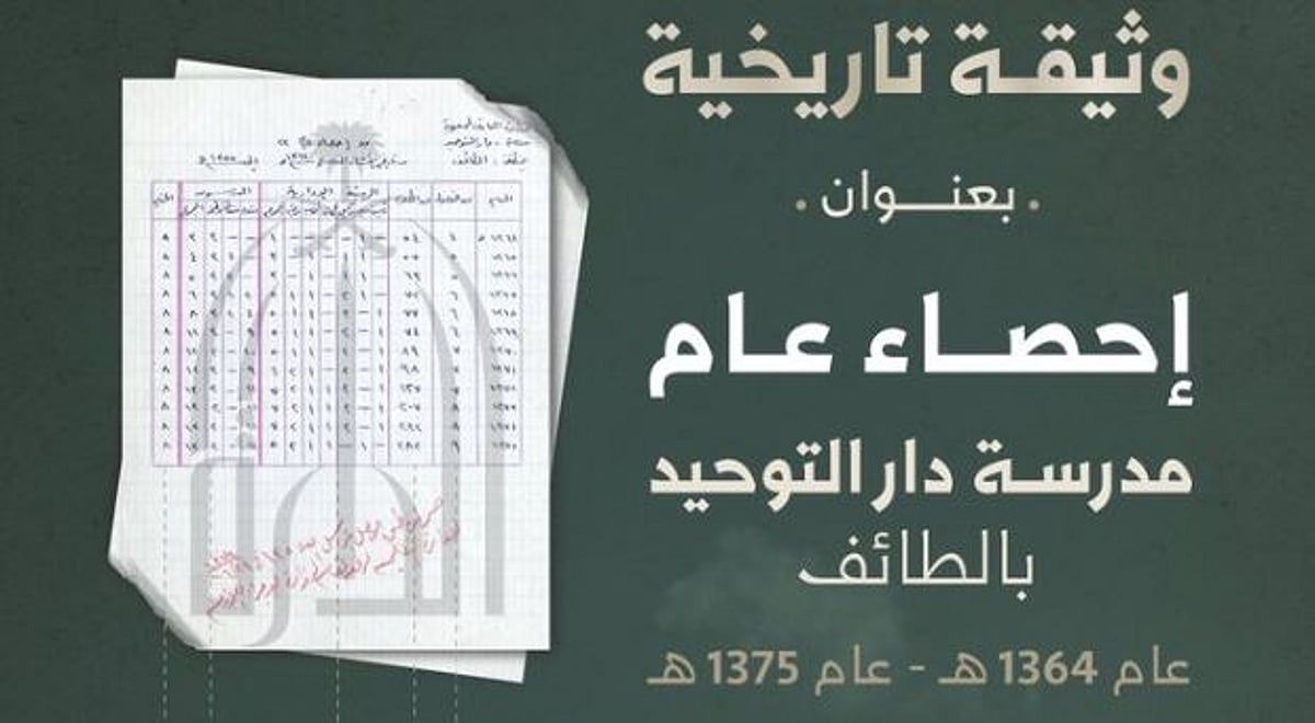 نشرت دارة الملك عبدالعزيز وثيقة تاريخية بعنوان "إحصاء عام مدرسة دار التوحيد بالطائف"، تغطي الفترة الزمنية من عام 1364هـ حتى عام 1375هـ، وتبرز مرحلة مفصلية في مسيرة التعليم النظامي بالمملكة، وتطوره في سنوات التأسيس، والبناء الإداري والتربوي، وذلك ضمن مبادرتها "وثائق الدارة".