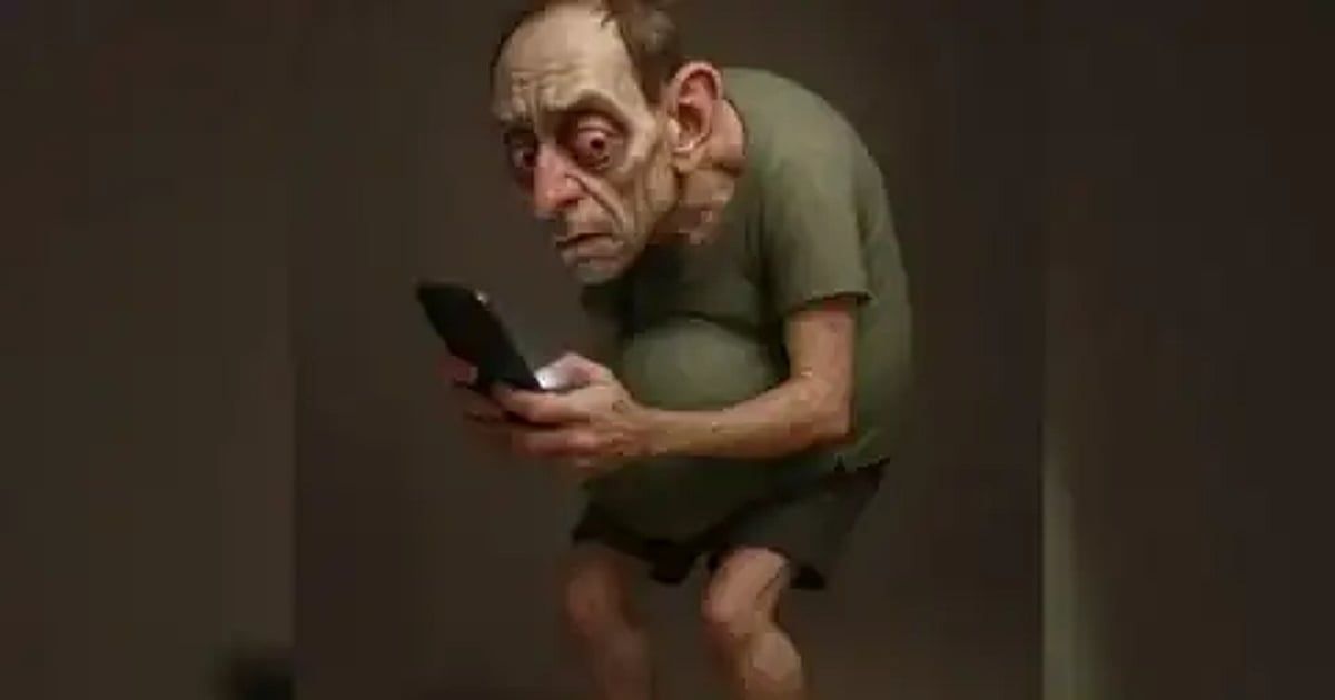 ويظهر النموذج بعيون غائرة وبشرة باهتة ورقبة منحنية تُعرف بـ"الرقبة التقنية"، في تصوير واقعي لنتائج الجلوس المفرط أمام الشاشات.