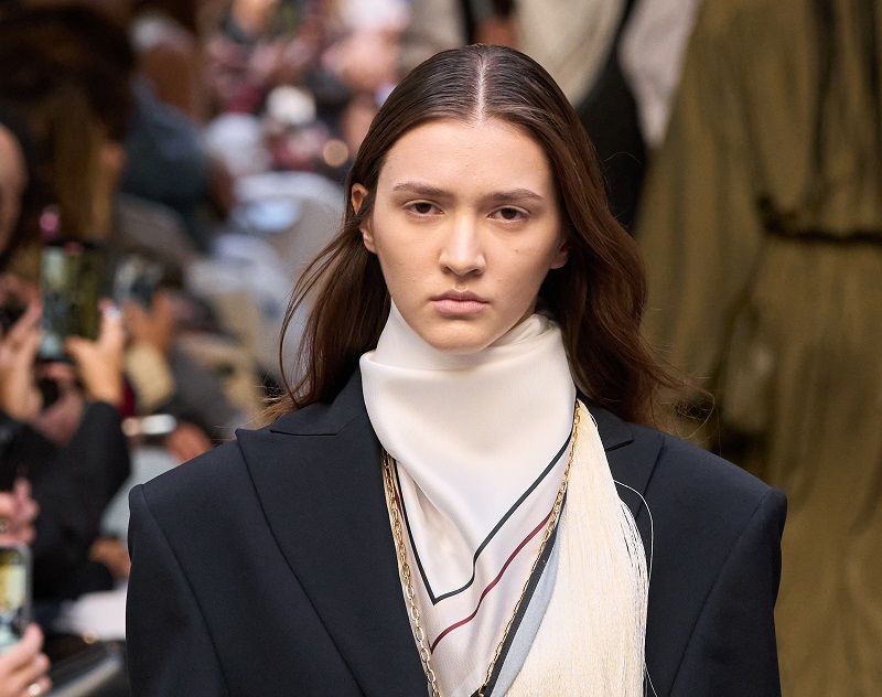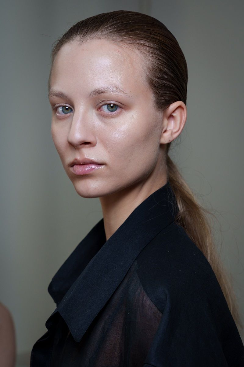 برزت صيحة جمالية راقية في عرض دار دانييل كالكاتيرا Daniele Calcaterra ، جسدت مفهوم "البساطة المترفّة". فقد تألقت العارضة بمكياج خفيف يكاد يكون غير مرئي، حيث تم التركيز على بشرة مضيئة بلمسة من الترطيب العميق، ما منحها إشراقة صحية. فيما جاءت العيون خفيفة الظلال مع تحديد ناعم يكاد لا يُلاحظ، بينما اكتفت الشفاه بلمعة شفافة حيادية أبرزت نعومتها الطبيعية. أما الشعر فجاء مشدوداً إلى الخلف، بأسلوب ذيل الحصان المنخفض. هذه التسريحة منحت العارضة حضوراً قوياً وأظهرت ملامح الوجه بجرأة واضحة، مع لمسة من العصرية التي تناسب إطلالات النهار والمناسبات الراقية.