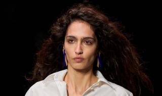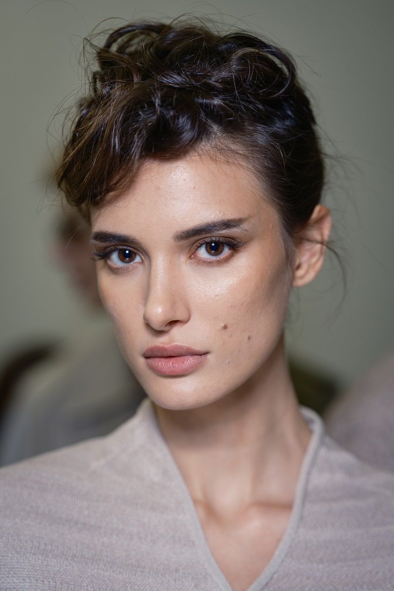 كما قدّم عرض دار دانييل كالكاتيرا Daniele Calcaterra، صيحة جمالية لافتة اعتمدت على المكياج النيود المطفأ الذي أعاد تعريف ملامح البساطة العصرية. فقد جاء المكياج هادئاً إلى حدّ الشفافية، مع اعتماد قاعدة خفيفة وموحّدة للبشرة تمنحها إشراقة طبيعية من دون أي لمعة زائدة. العيون بدت كأنها من دون مكياج مع لمسة من الظلال النيود الباهتة، بينما جاءت الشفاه مطفأة بلون حيادي يقترب من درجات البشرة. أما تسريحة الشعر، فجاءت انسيابية ملساء مع فرق وسطي مستقيم، انسابت الخصل برقة على جانبي الوجه لتؤطّر الملامح بهدوء ورقي. هذه الإطلالة لم تكتفِ بتكريس مفهوم البساطة، بل عكست أيضاً قوة الحضور التي تمنحها التفاصيل الناعمة.