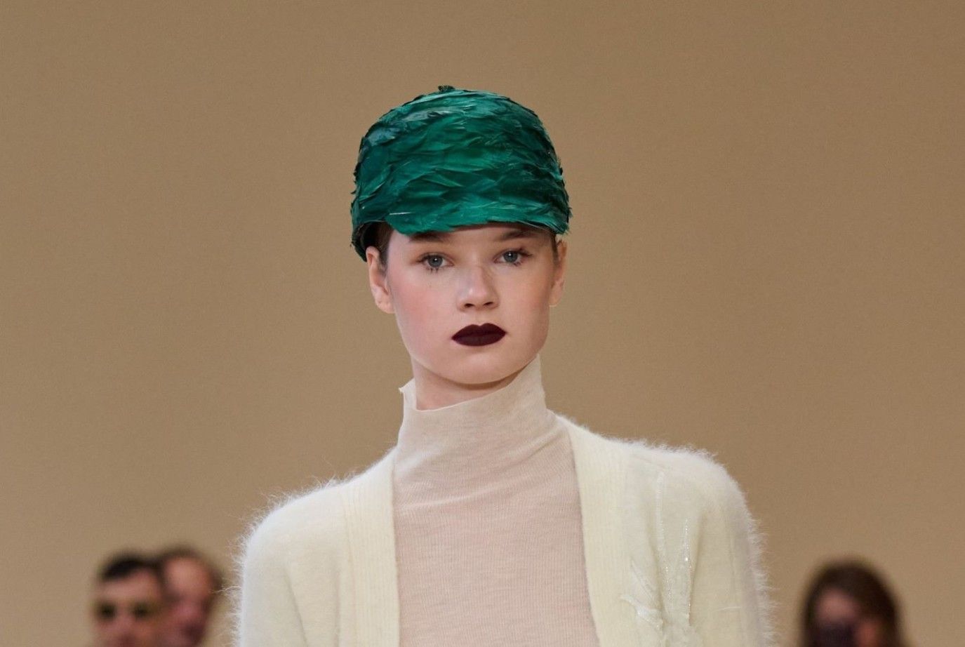هذه الإطلالة تعكس لمسة راقية تناسب السهرات والمناسبات، حيث يلم الشعر كله للخلف ليبرز ملامح الوجه، وتزين القبعة الصغيرة من الأمام بريش أخضر يغمرها بجاذبية، الأكسسوار الأخضر هنا يمنح الشعر حضوراً مميزاً يجمع بين الأناقة الكلاسيكية.