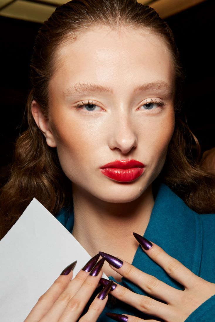 المناكير الزجاجي لايزال متربّعاً على عرش الصيحات الجمالية، وفي الخريف يتألّق باللون البنفسجي الداكن؛ فهو يمنح الأظافر مظهراً شفافاً برّاقاً يُضفي عليها بُعداً زجاجياً متوهّجاً. يمكنكِ اعتماده لوحده، أو فوق طبقة مناكير مطفي لتعزيز العمق.