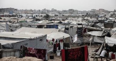 مسن فلسطينى يجلس بجوار الأطفال وسط الخيام