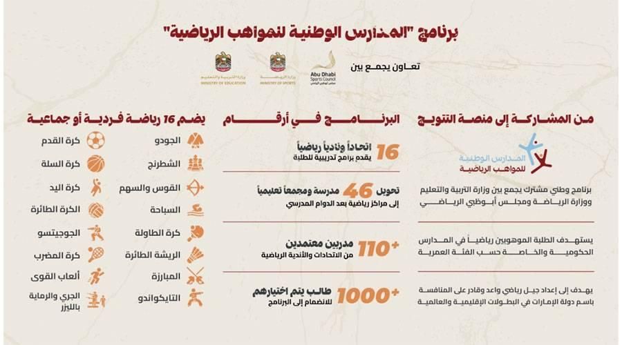 أعلنت وزارة التربية والتعليم بالتعاون مع وزارة الرياضة ومجلس أبوظبي الرياضي عن إطلاق برنامج «المدارس الوطنية للمواهب الرياضية» الذي يمثل أحد المشاريع الوطنية الاستراتيجية الرامية إلى تطوير الرياضة المدرسية وتحويلها إلى مسار مستدام لاكتشاف ورعاية المواهب الرياضية الناشئة في الدولة، ودعمها وتطويرها بما يحقق رؤية الدولة في هذا المجال.