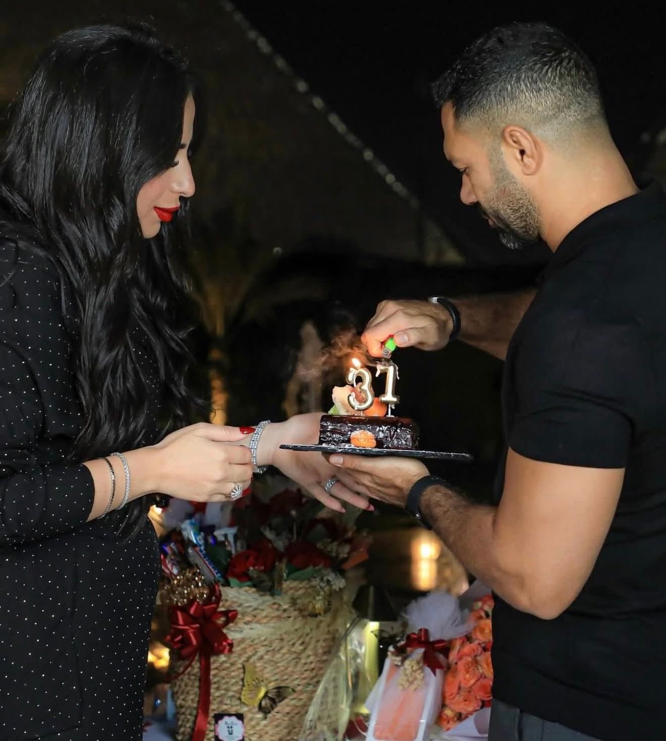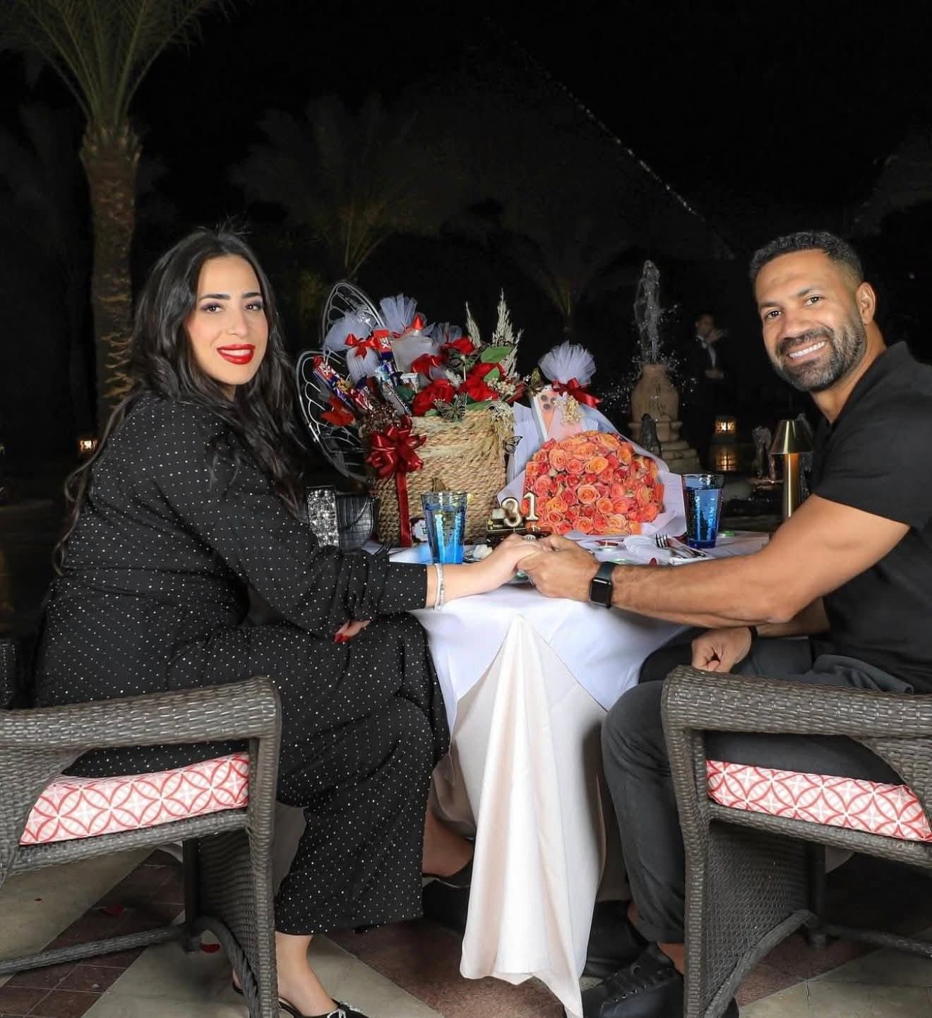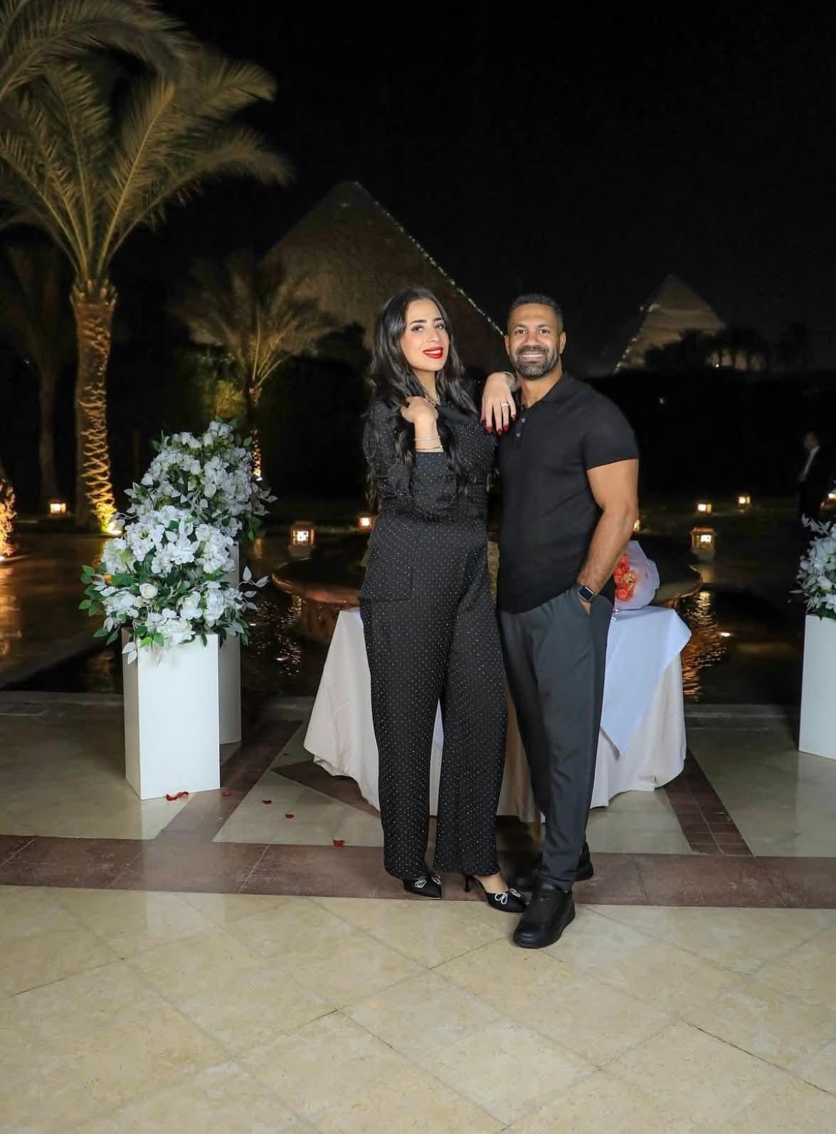 ومنذ ساعات قليلة، احتفل حسني عبد ربه بعيد ميلاد زوجته ميرنا غيط في أجواء رومانسية تحت سفح الأهرامات.