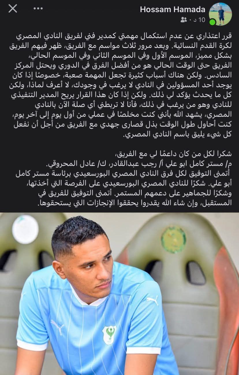 وكتب حسام حمادة: قررت اعتذاري عن عدم استكمال مهمتي كمدير فني لفريق النادي المصري لكرة القدم النسائية، وبعد مرور ثلاثة مواسم مع الفريق، ظهر فيهم الفريق بشكل مميز الموسم الأول وفي الموسم الثاني وفي الموسم الحالي، الفريق حتى الوقت الحالي هو من أفضل الفرق في الدوري ويحتل المركز السادس.