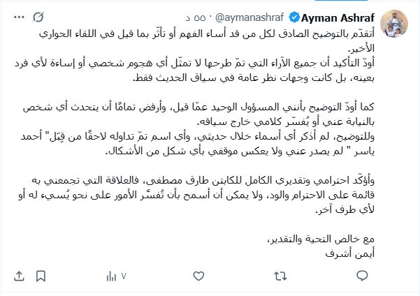 وكتب أيمن أشرف، عبر حسابه الشخصي على موقع "X"، "أتقدّم بالتوضيح الصادق لكل من قد أساء الفهم أو تأثّر بما قيل في اللقاء الحواري الأخير، أودّ التأكيد أن جميع الآراء التي تمّ طرحها لا تمثّل أي هجوم شخصي أو إساءة لأي فرد بعينه، بل كانت وجهات نظر عامة في سياق الحديث فقط".