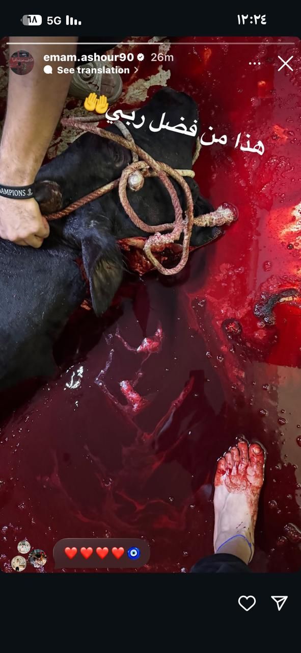 نشر إمام عاشور صانع فريق الأهلى ومنتخب صورة له عبر الاستورى الخاص بموقع التواصل الاجتماعى إنستجرام عقب ذبح عجل، وعلق إمام عاشور على الصورة قائلا"هذا من فضل ربى".