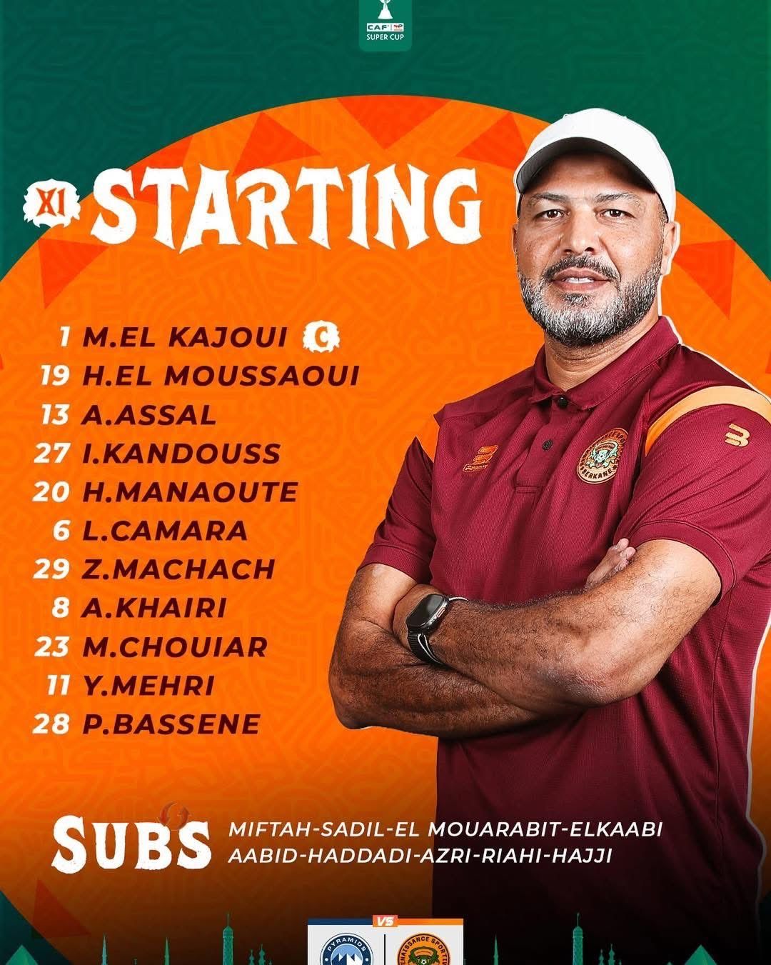 أعلن معين الشعباني، المدير الفني لفريق نهضة بركان، التشكيل الرسمي ضد بيراميدز  في المباراة المقرر إقامتها فى الثامنة مساء اليوم السبت على ملعب "30 يونيو" فى نهائي السوبر الأفريقي 2025.