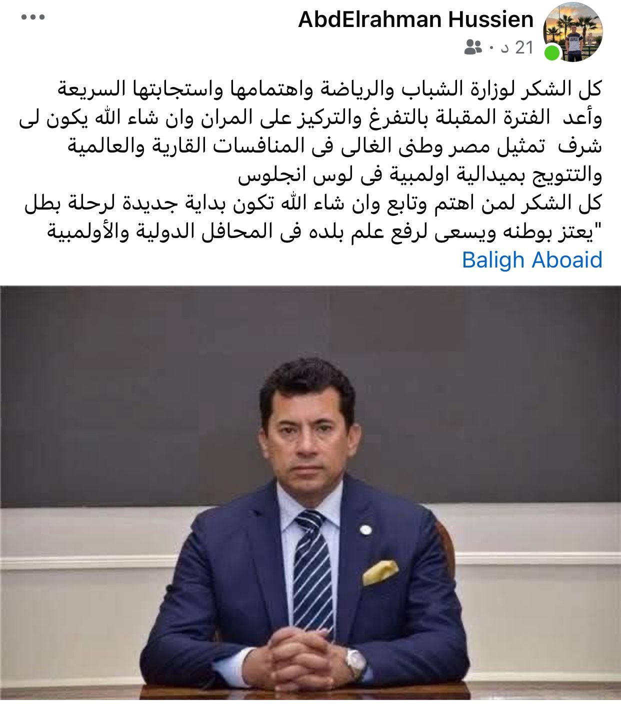 كل الشكر لوزارة الشباب والرياضة واهتمامها واستجابتها السريعة وأعد الفترة المقبلة بالتفرغ والتركيز على المران وان شاء الله يكون لى شرف تمثيل مصر وطنى الغالى فى المنافسات القارية والعالمية والتتويج بميدالية اولمبية في لوس أنجلوس