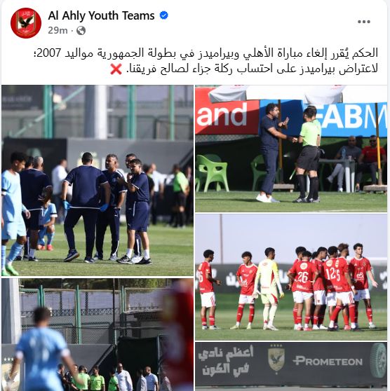 وكتبت الصفحة الرسمية لشباب الأهلي في منشور لها: "الحكم يُقرر إلغاء مباراة الأهلي وبيراميدز في بطولة الجمهورية مواليد 2007؛ لاعتراض بيراميدز على احتساب ركلة جزاء لصالح فريقنا".