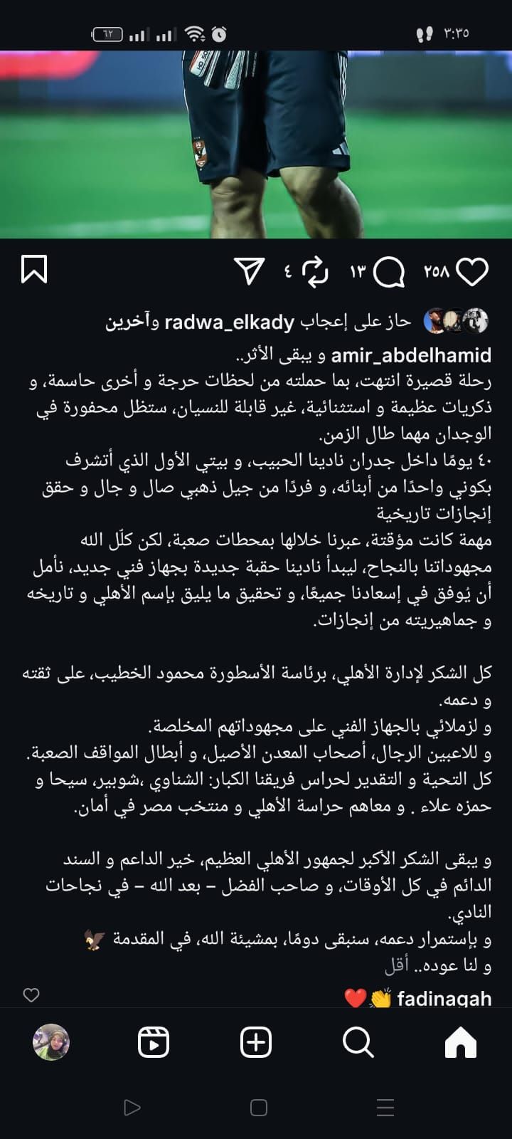 وواصل أمير أميد عبد الحميد : كل الشكر لإدارة الأهلي، ولزملائي بالجهاز الفني على مجهوداتهم المخلصة ، وللاعبين الرجال، أصحاب المعدن الأصيل، وأبطال المواقف الصعبة. كل التحية والتقدير لحراس فريقنا الكبار الشناوي ، شوبير، سيحا و حمزه علاء . و معاهم حراسة الأهلي و منتخب مصر في أمان.