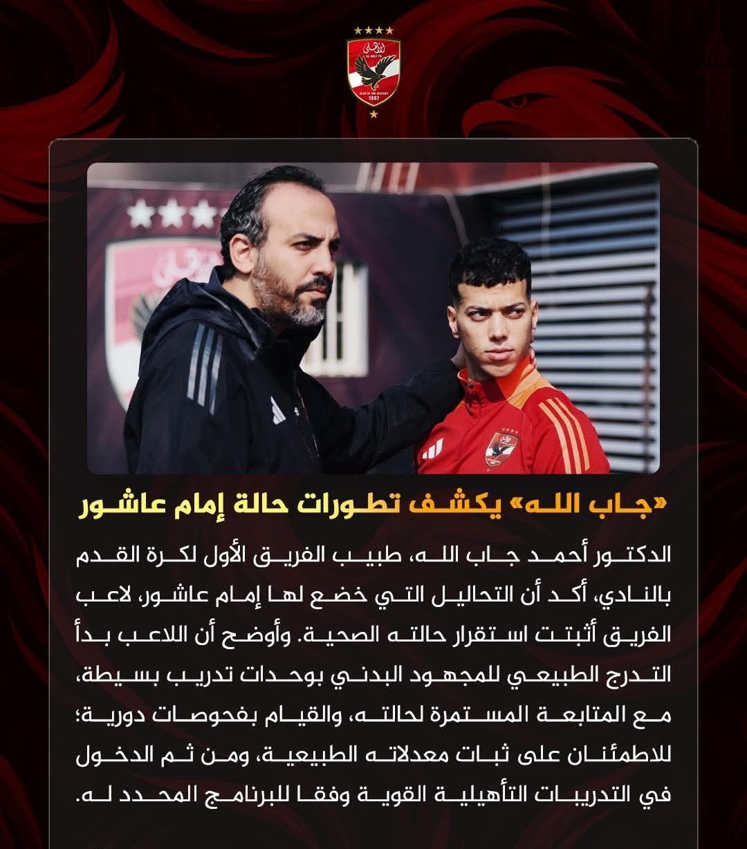 وأوضح أن اللاعب بدأ التدرج الطبيعي للمجهود البدني بوحدات تدريب بسيطة، مع المتابعة المستمرة لحالته، والقيام بفحوصات دورية؛ للإطمئنان على ثبات معدلاته الطبيعية، ومن ثم الدخول في التدريبات التأهيلية القوية وفقا للبرنامج المحدد له.