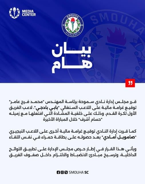 قرر مجلس إدارة نادي سموحة برئاسة المهندس محمد فرج عامر توقيع غرامة مالية على اللاعب السنغالي بابي بادجي، لاعب الفريق الأول لكرة القدم، وذلك على خلفية المشادة التي افتعلها مع زميله حسام أشرف خلال المباراة الأخيرة.