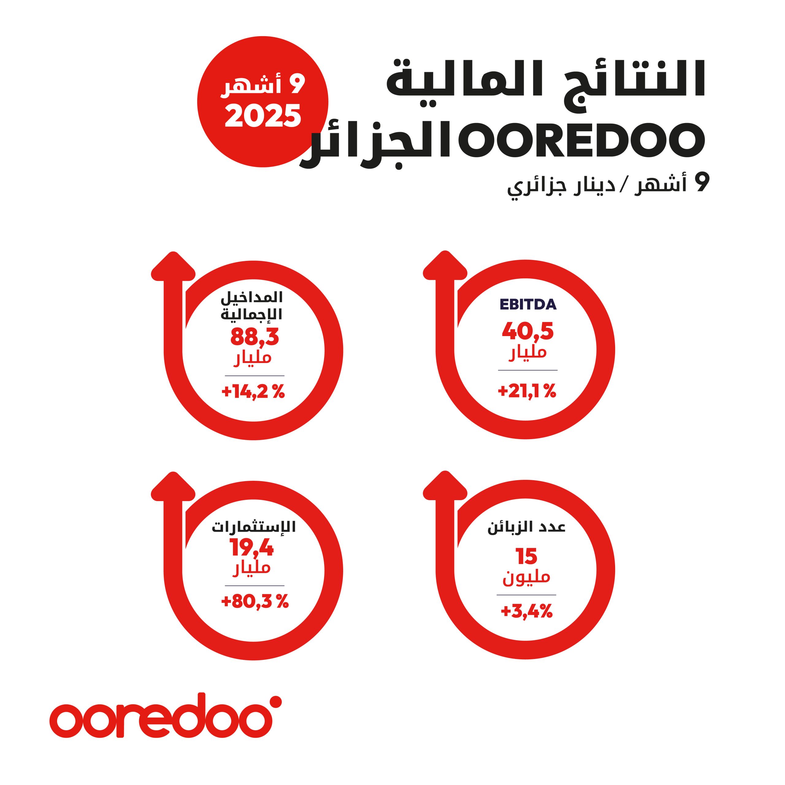 وبالأرقام،بلغت إيرادات Ooredoo الجزائر88،3 ملياردينار جزائري خلال التسعة أشهر الأولى من السنةالجارية مقابل 77،3مليار دينار جزائري. مقارنة بنفس الفترة من سنة 2024،أي بنمو قدره14،2٪.