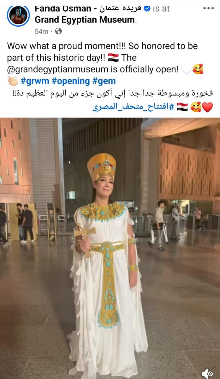 احتفت البطلة فريدة عثمان لاعبة منتخب السباحة، بمشاركتها في حفل افتتاح المتحف المصري الكبير، وظهورها بالزي الفرعوني خلال أحد العروض بالحفل.