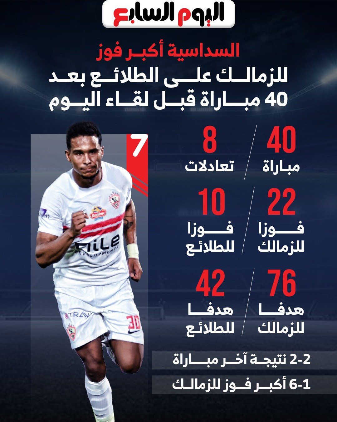 تعد مباراة اليوم الـ41 بين فريق الزمالك ونظيره الطلائع، حيث سبق أن تواجها في 40 مباراة من قبل، حقق الزمالك الفوز في 22 وفاز الطلائع فى 10 مواجهات وحسم التعادل 8 لقاءات بين الفريقين، وسجل لاعبو الأبيض 76 هدفا بينما سجل لاعبو الطلائع 42 هدفا.