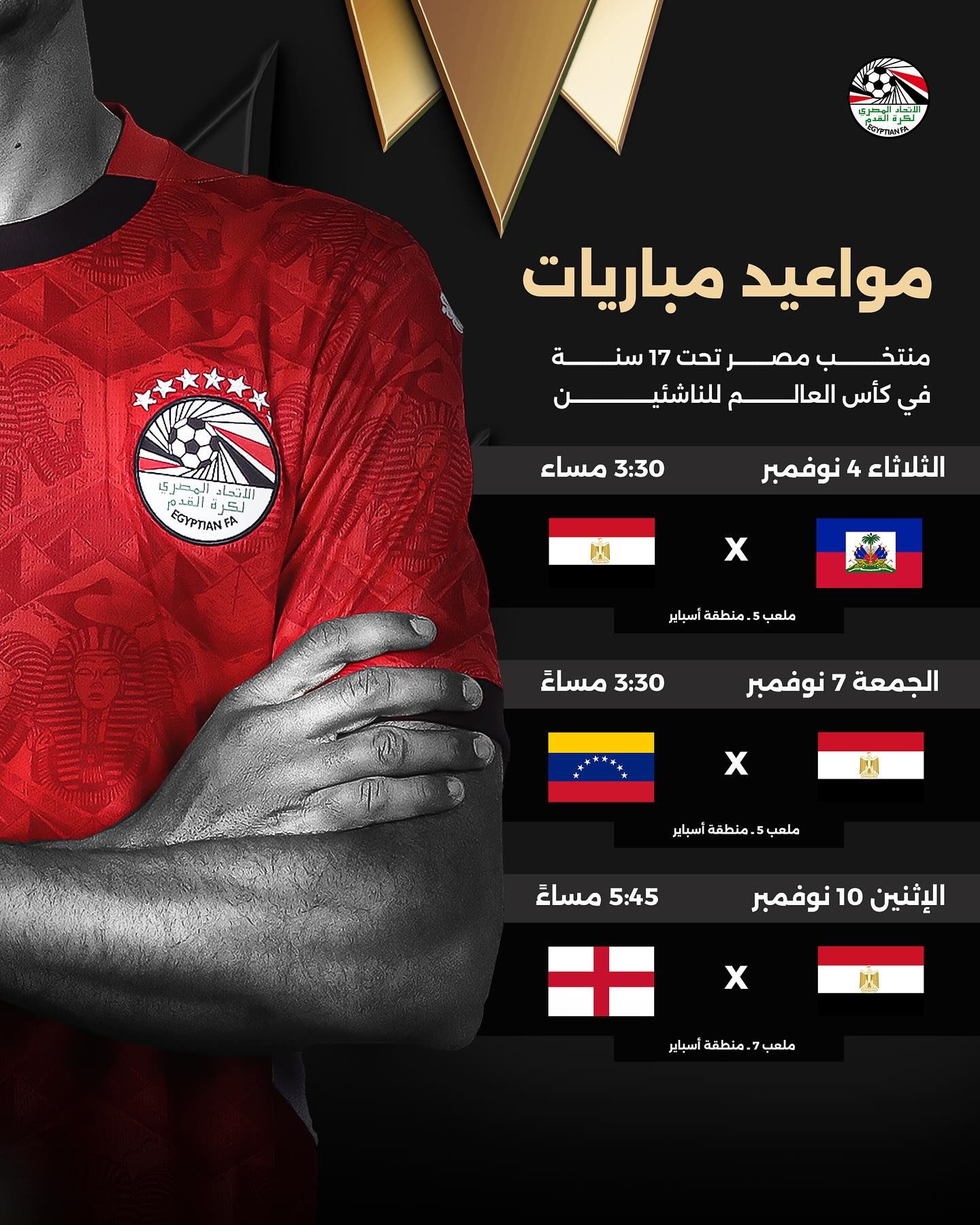 وأعلن الاتحاد الدولى لكرة القدم فيفا جدول مباريات منتخب مصر للناشئين في كأس العالم بقطر نوفمبر الجارى ، كالتالي: