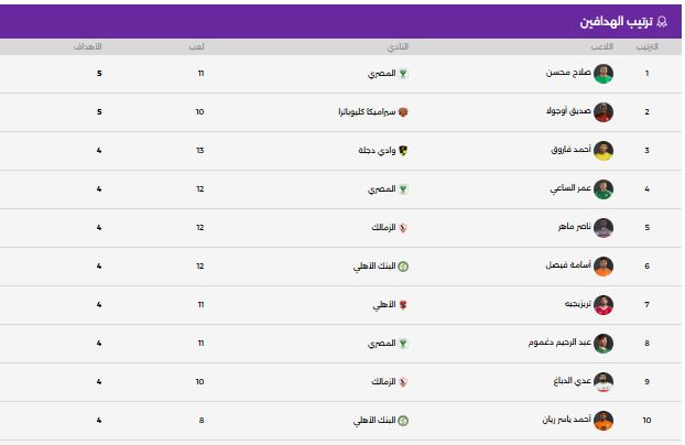 تقاسم الثنائى صلاح محسن مهاجم فريق المصرى البورسعيدى والنيجيرى صديق إيجولا مهاجم فريق سيراميكا جدول ترتيب هدافى مسابقة الدورى المصرى الممتاز برصيد 5 أهداف لكل منها عقب إقامة اليوم الثلاثاء الموافق 4 – 11 – 2025 ثلاث مباريات في ختام الجولة الـ13 من عمر المسابقة، حيث التقى زد مع نظيره البنك الأهلى وواجه المقاولون فريق سموحة وأستضاف وادى دجلة فريق حرس الحدود.