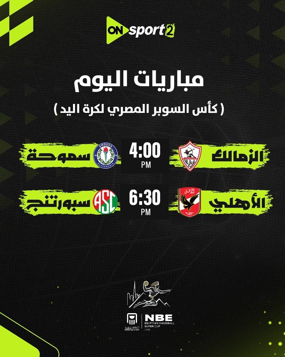 مواجهة الزمالك أمام سموحة الرابعة عصرا تقام فى الرابعة عصر اليوم مواجهة الزمالك أمام سموحة، بينما يلتقى يد الأهلى مع سبورتنج فى تمام السادسة والنصف مساءا.