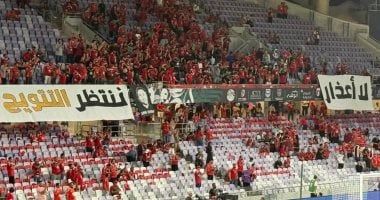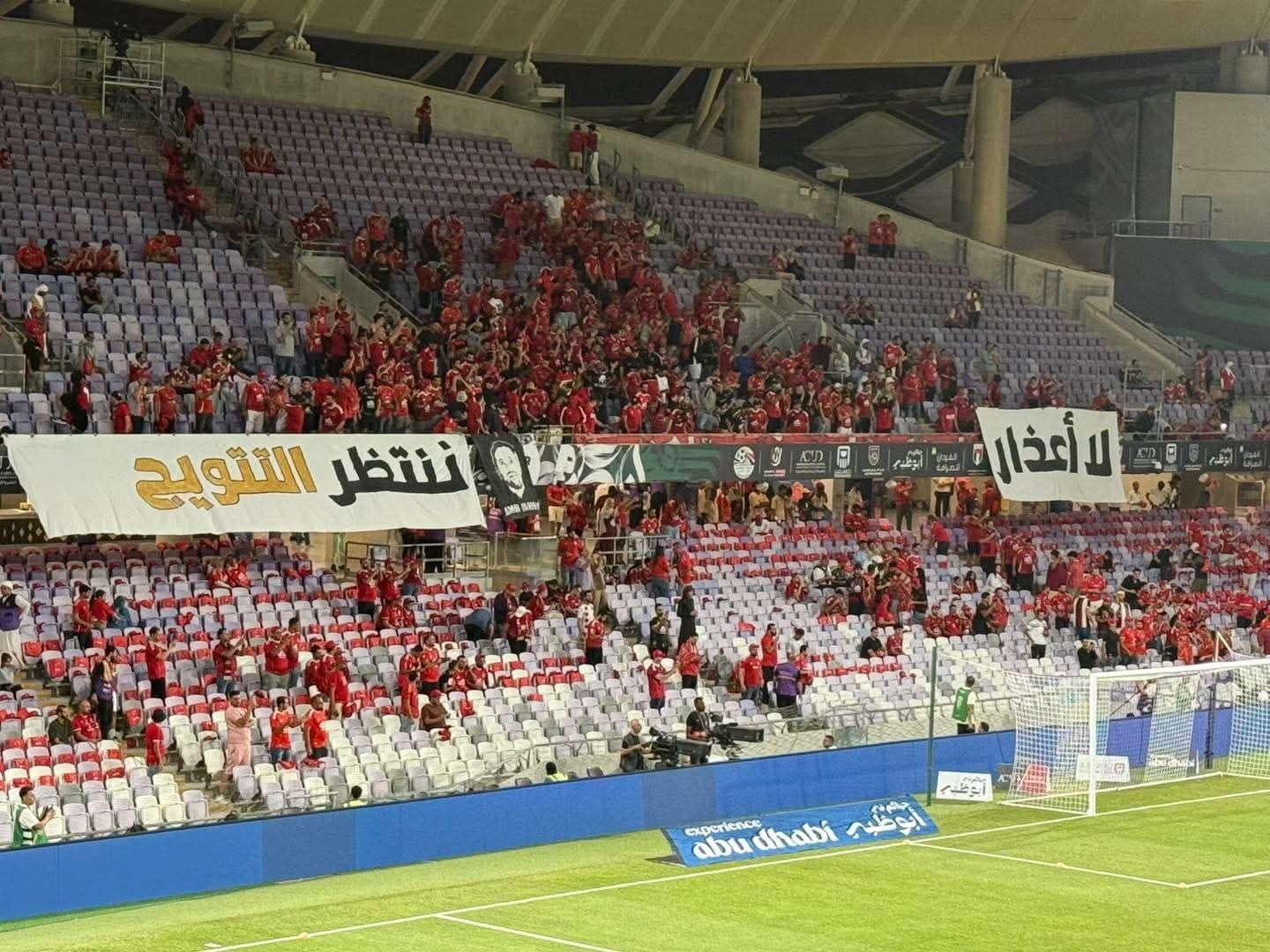 الخميس، 06 نوفمبر 2025 04:27 مرفع عدد من جماهير الأهلي المتواجدة في مدرجات ملعب هزاع بن زايد بمدينة العين الإماراتية لافتة كبيرة مكتوب عليها ، : " لا أعذار ..ننتظر التتويج" في رسالة تحذيرية من الجمهور للاعبين بضرورة الفوز ببطولة السوبر المصري التي تنطلق بعد قليل بالإمارات دون البحث عن أي أعذار.