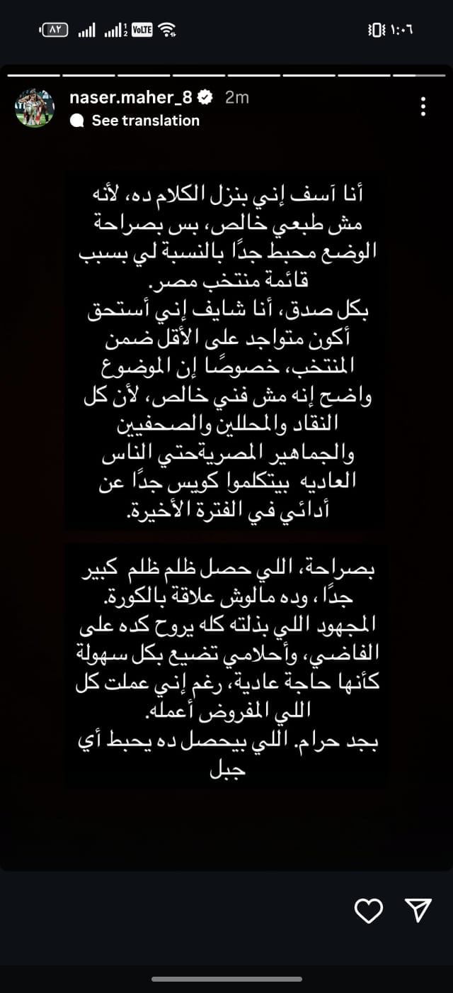 وكتب ناصر ماهر، عبر حسابه الشخصي على انستجرام، أنا آسف إني بنزل الكلام ده، لأنه مش طبعي خالص، بس بصراحة الوضع محبط جدا بالنسبة لي بسبب قائمة منتخب مصر.