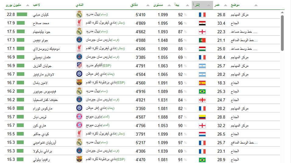 ونشر المركز الدولى للدراسات الرياضية "CIES" اليوم تقريراً كشف فيه أن النجم الفرنسي كيليان مبابي، مهاجم ريال مدريد، يتصدر قائمة أعلى اللاعبين أجرًا فى العالم بين أصحاب العقود الجارية، إذ يتقاضى 22.8 مليون يورو سنويًا.