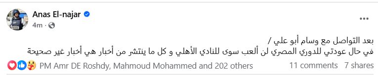 وقال النجار عبر حسابه على فيسبوك: "بعد التواصل مع وسام أبو علي، في حال عودتي للدوري المصري لن ألعب سوى للنادي الأهلي و كل ما ينتشر من أخبار هي أخبار غير صحيحة".
